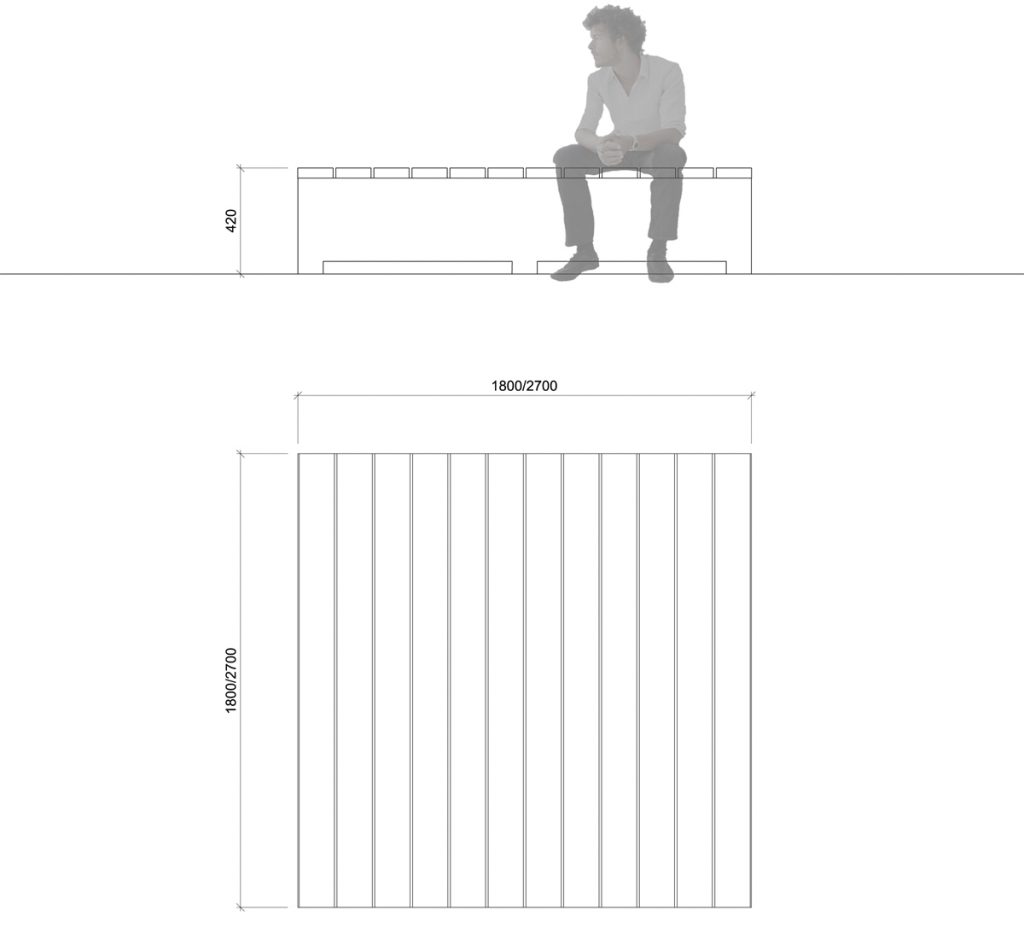 1800mm x 1800mm x H420mm - Dispositivo USB en opción: 2 Tomas USB IP55 – 5V-1500mA